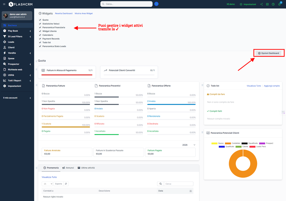 La dashboard presenta diversi widget che puoi personalizzare in base alle tue esigenze: