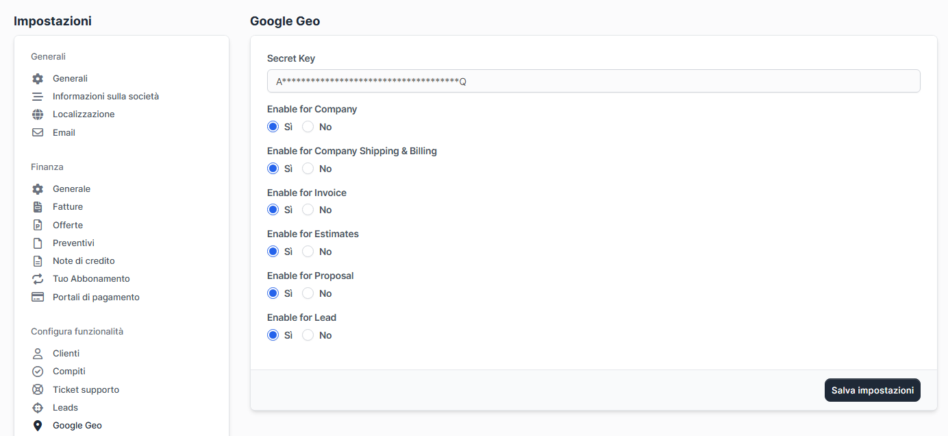 Copia la tua chiave e incollala nelle impostazioni del modulo Google Geo in FlashCRM.
