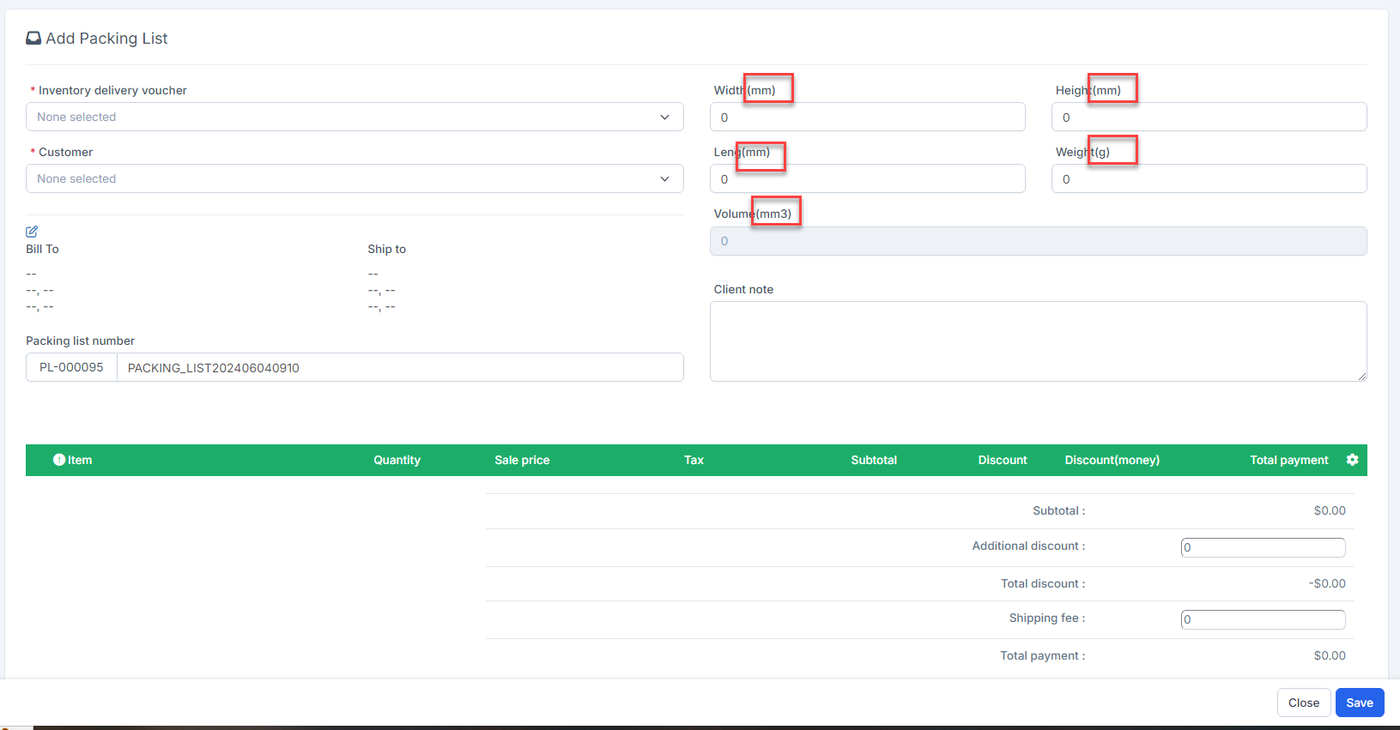 Per creare misure imperiali (sistema britannico) personalizzate per i campi Larghezza, Altezza, Lunghezza, Volume e Peso nella Packing List:
