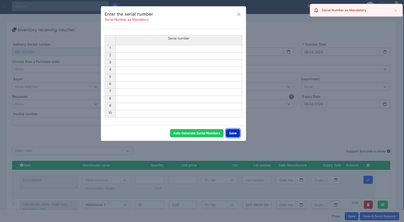 La schermata Aggiungi/Modifica Voucher di ricezione dell'inventario mostrerà un popup per inserire il numero di serie.