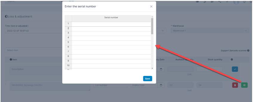 La schermata Aggiungi/Modifica Perdita e aggiustamento mostrerà un popup per inserire il numero di serie.