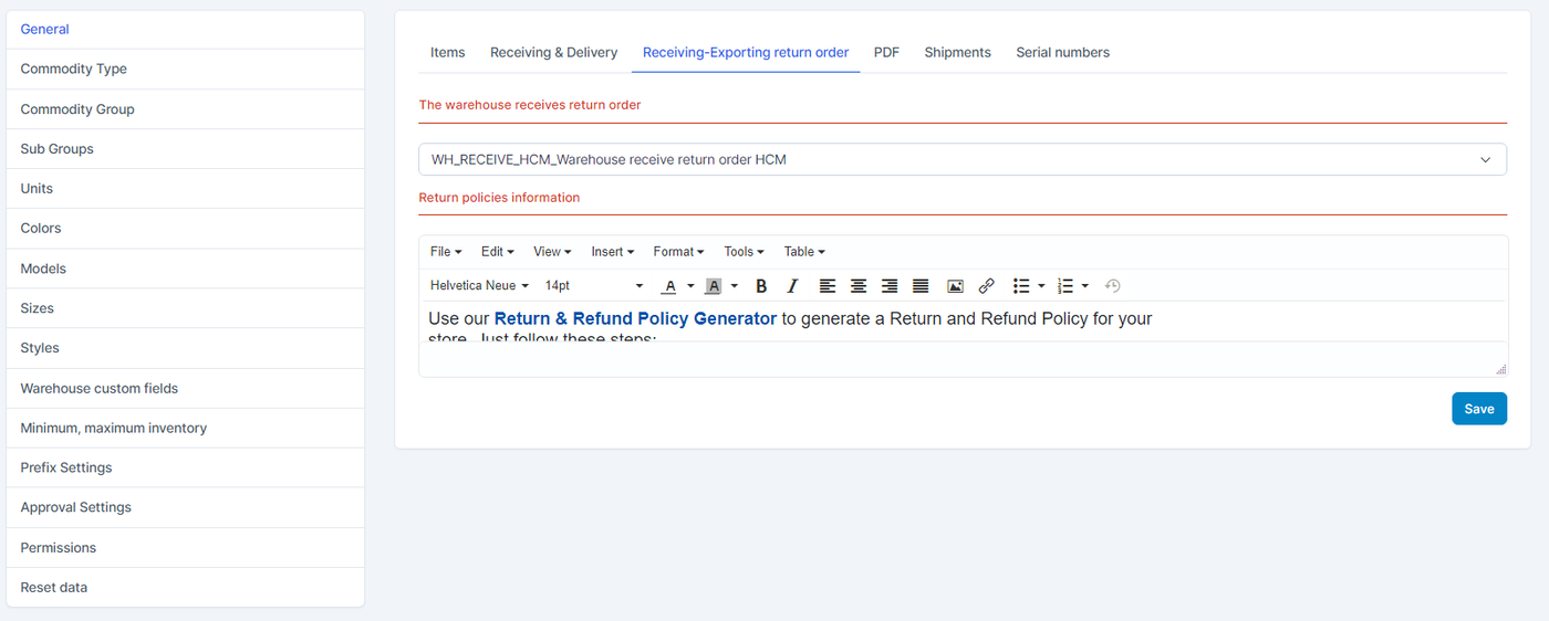 La tab Ricezione-Esportazione dell'ordine di reso nelle impostazioni generali consente di configurare il magazzino predefinito per i resi e le politiche di reso.
