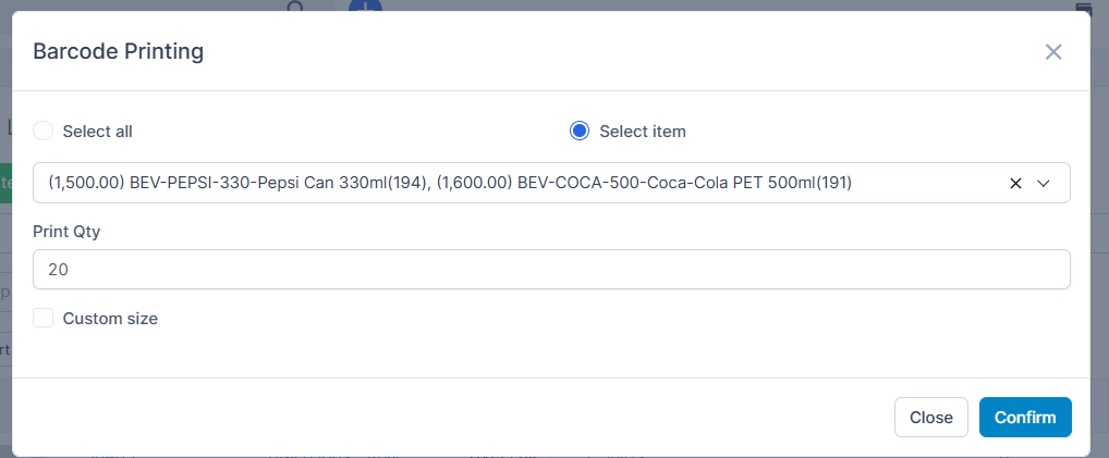 Step 2 – Imposta la quantità di stampa. Inserisci la Quantità di stampa, ovvero il numero di codici a barre da stampare per ciascun prodotto selezionato.